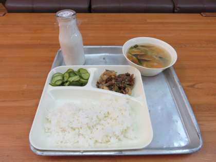 プルコギ、トック、あっさりきゅうり、ごはん、牛乳です。朝鮮半島でよく食べられている料理を日本風にアレンジしてあります。プルコギの味はすき焼き風です。