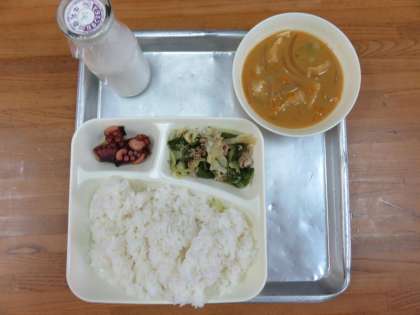 たこのやわらか煮、みそ汁、野菜炒め、ごはん、牛乳です。