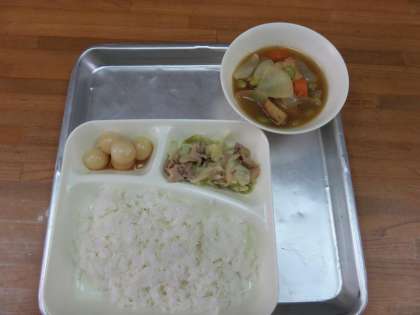 鶏肉とさといもの煮もの、豚肉とキャベツのしょうがいため、みたらしだんご、ごはん、牛乳です。月にだんごを供えるところから、みたらし団子が入っています。
