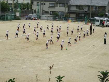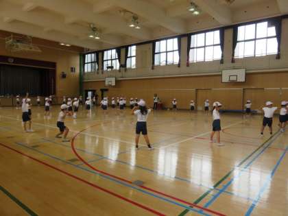 台風一過の青空、とはいきませんが運動場での練習ができるようになりました。講堂での、どのタイミングでどの動きをするか、いくつ数えたら次の動きに変えるかなど細かな指導の後、運動場での立ち位置や全体の流れを確認しました。どの子も一所懸命取り組んでいる姿がありました。本番までがんばれ!!