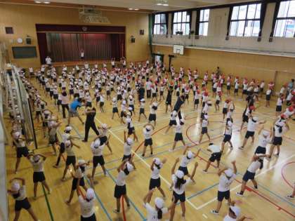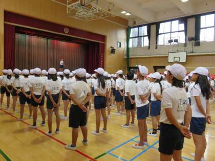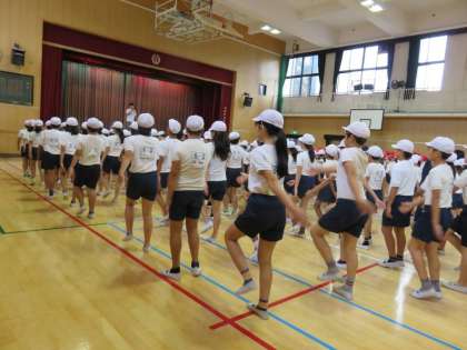 雨のため、練習場所を講堂に移して、行進、校歌、終わりの体操、成績発表の聞き方の練習を行いました。10月2日(日)に運動会ができるよう天気の回復を願ってください。