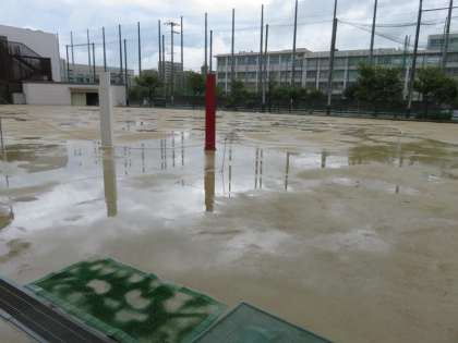 1時間目から総合練習をしようと入場行進の隊形に集合した途端大粒の雨が降り出し、運動場はあっという間に一面水たまりになってしまいました。