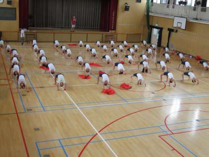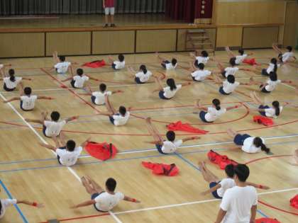 6年生の団体演技は、止めるところは止める。そろえるところはそろえる。といったわざの「切れ」が求められます。疲れてきてもやり遂げる気力や体力が必要です。