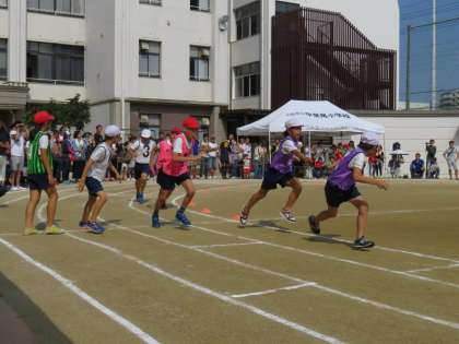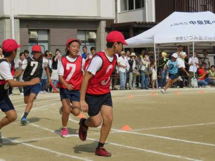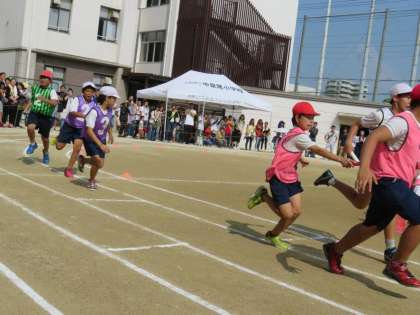 ゴールテープを切るまで赤が勝つか白が勝つかわからないレースばかりでした。さすが高学年、バトンの受け渡しも上手です。