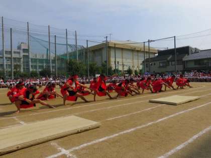 小学校最後の運動会での最後の種目は、6年生による組み立て体操です。音楽に合わせた動きや表現活動を組み合わせ今までにない組体に取り組みました。夏休みの前から子どもたちの実態に合わせどのような技を取り入れるか、話し合いを続けました。