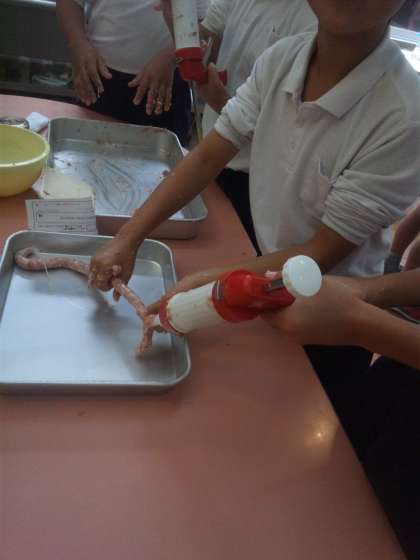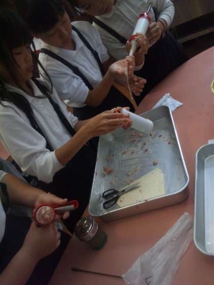 ピストルの様な器具の先に羊の腸が付いており、レバーを握るとひき肉が押し出されソーセージの長い紐の形なっていきます。
