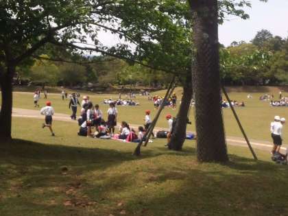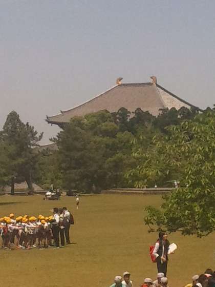 東大寺の甍が見える広場でお弁当を食べて、芝生や木立の中で鬼ごっこやだるまさんが転んだをして遊びました。