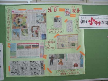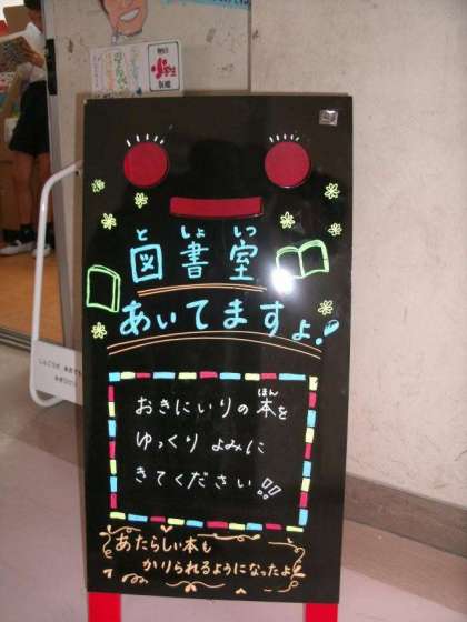 図書館前の壁面には、小学生新聞の記事が分かりやすくレイアウトされています。また開館時間には、おしゃれな看板が出ています。水曜日は、放課後も開館していて小澤さんがいらっしゃるので尋ねてみましょう。