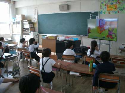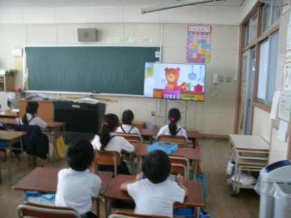 英語に「なれる」ということで、月・水・金曜日の給食時間中に英語の歌を聴きます。まず、耳から音になれることが目的です。