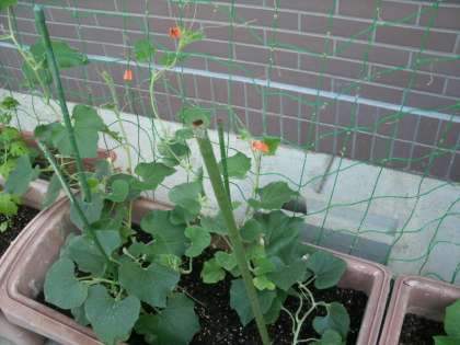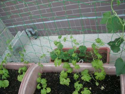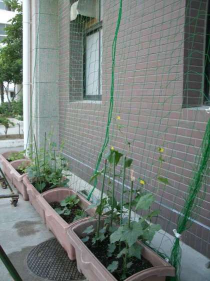その活動を利用して、緑のカーテンになるよう、管理作業員さん2人に2階までネットを