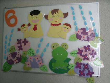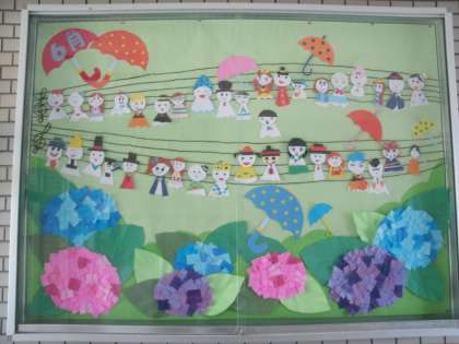 給食室前には、大きなカエルと鮮やかなアジサイの花を眺めるテルテル坊主の家族です。