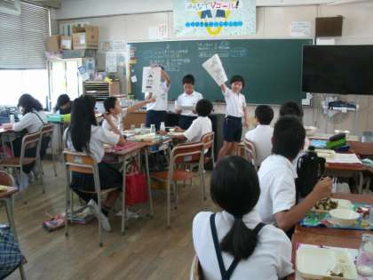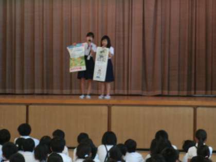 児童集会で呼びかけるとともにポスターを描いて校内に貼ったり、クラスに行って応募の説明もしたりしました。
