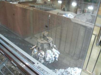 パッカー車で集められたごみを大きな爪をもったクレーンが移動させます。