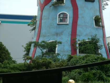 自然環境との調和を重視し、エコロジー技術と芸術の融和をテーマに建物をデザインしたそうです。「自然には直線は存在しない」ことから曲線をたくさん使い、緑で覆うように建てられています。