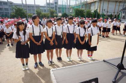 6月26日(月)児童朝会で全校児童の前で団体表彰と個人表彰を行いました。子ども会の北村様、警察署の方々も来てくださいました。