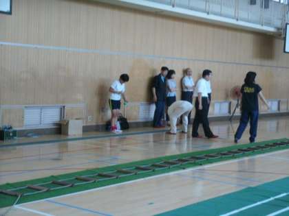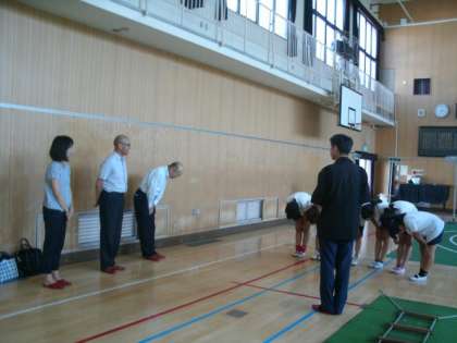 8月19日に大阪府交通安全協会の所長さん以下3人の方が、中泉尾小学校の練習を見に来て下さり、励ましのお言葉をかけていただきました。当日も大会に出席してくれるそうです。子ども達は難しい種目の完成度を上げるため警察署の方や北村さんの指導を受けながら練習に励んでいます。練習の準備などを手伝う仲間の姿がとてもいい感じです。