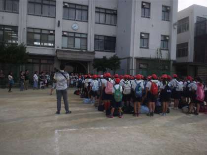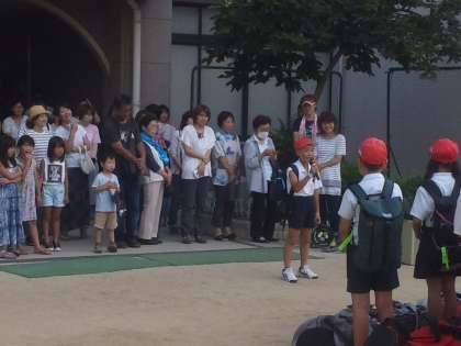 5年生71名全員揃って、出発式を行い、たくさんの保護者の皆様や先生方の見送りの中ハチ高原に向かって出発しました。