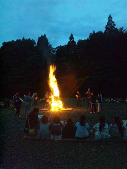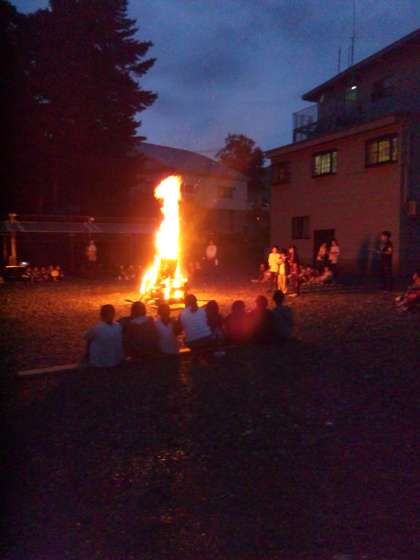 火の子ども達5人の誓いの言葉と点火からキャンプファイアが始まりました。大阪にいる保護者の皆様の晴れてほしいという願いが雨雲を押しやってしまったのでしょう。