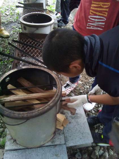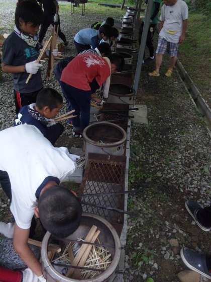 今日の昼食は、自分達で作るカレーです。火起こし係は薪を燃えやすい材料から組んでいきます。