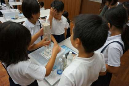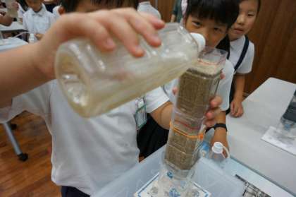 砂の上から汚れた臭いのする水を注ぎます。下から出てきた水は透明になっています。