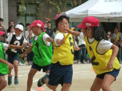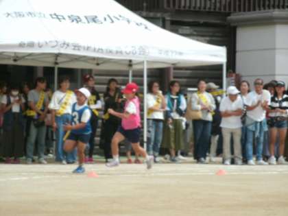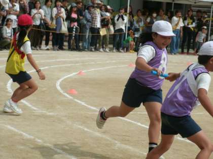 トラックを走り、バトンを渡すリレーは3年生からです。落とさずしっかりつなげています。
