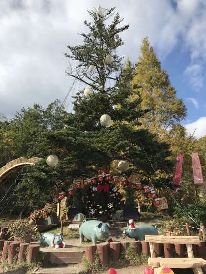 クリスマスのモニュメントがお出迎えしてくれました。モミの木も飾り付けが終わっています。