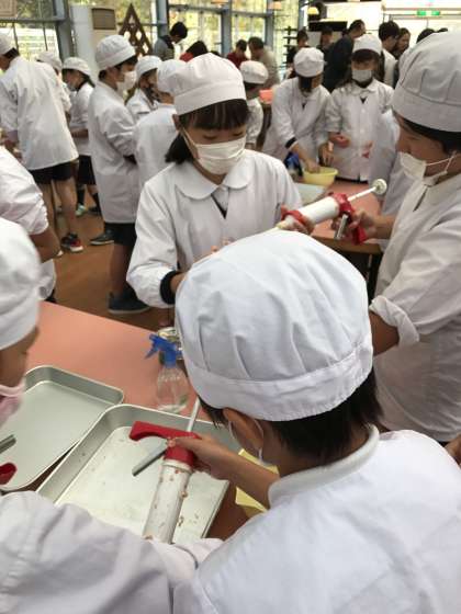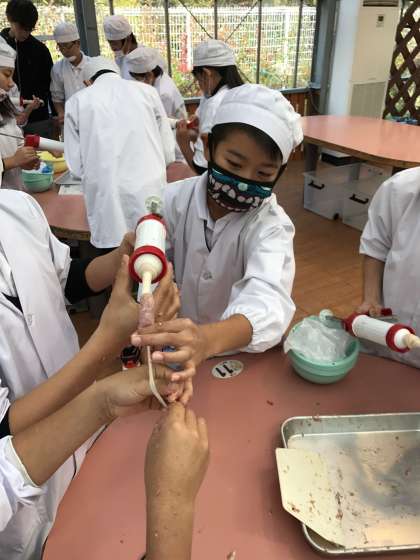 ピストルの様な機械に挽き肉を入れて腸の中に入れて行きます。空気を入れない様に太くなく細くなく上手に入れるのに苦労しています。