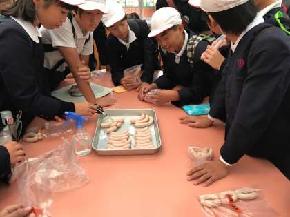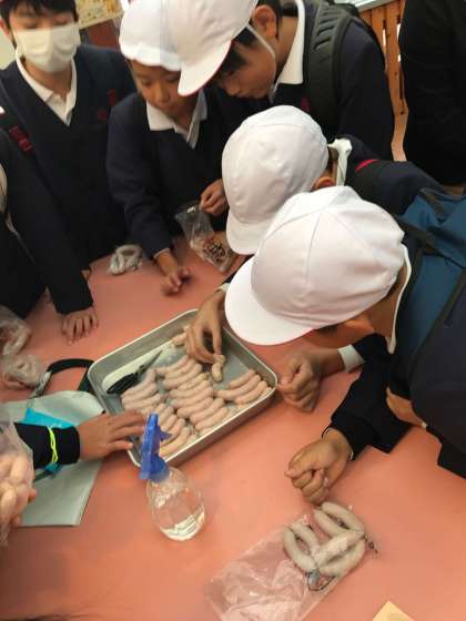 茹で上がったウインナーを班員で分けて袋詰めしています。