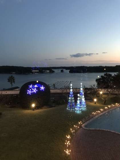 日が沈み夕暮れにホテルの庭のライトアップが綺麗です。