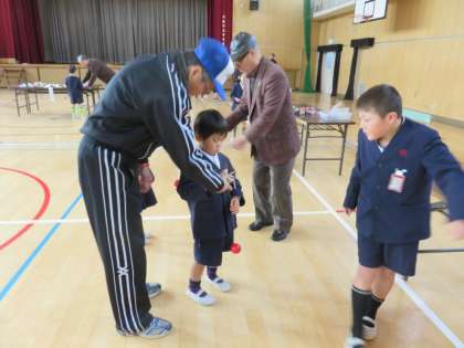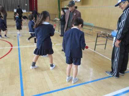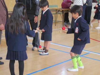 世界大会まであるけん玉です。遊びの中でも世界中に広がっており一番知られているのではないでしょうか。十字のけんと穴の開いた球を紐で繋げただけの単純な構造ですが遊び方は優しいものから高度な技まで楽しみ方の奥が深いです。子ども達は苦戦していました。