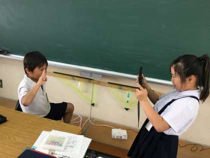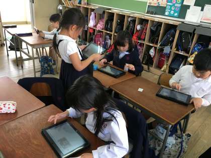 1人1台のタブレットを使用して友だちの写真を撮り、名前を書いていきました。