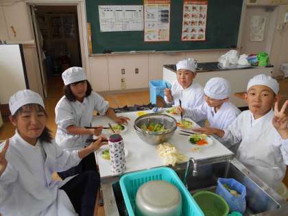 5月23日水曜日に5年生が、調理実習をしました。「ゆで野菜サラダ」を作りました。みんなおいしく食べていました。