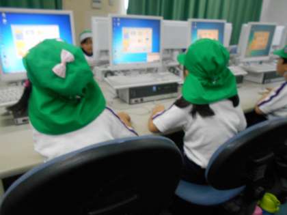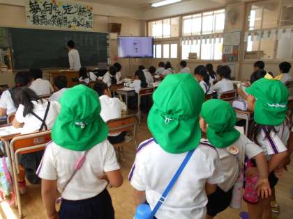 校舎内も廊下は暑いので、授業をしている各教室に少しずつ入って、体を冷やしながらいろいろな教室を見て回りました。園には無い、長い階段も元気に上がったり下りたりして楽しく見学できていました。体験授業では、きちんと話を聞きながら活動できました。