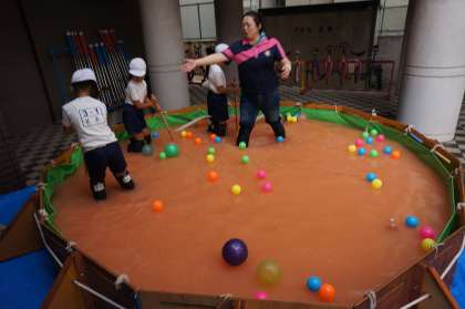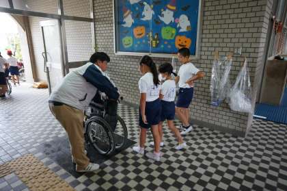 災害弱者誘導訓練では、保護者の方にお手伝いをしていただきました。