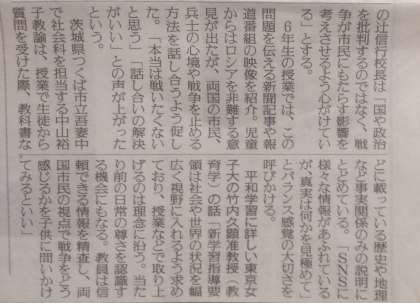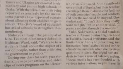 この学習の様子は、当時、添付している資料の通り、たくさんのマスメディアにも取り上げられました。「ウクライナとロシア」、「パレスチナとイスラエル」のような戦争や紛争は、小学校の学習ではなかなか取り上げにくいからだと思います。