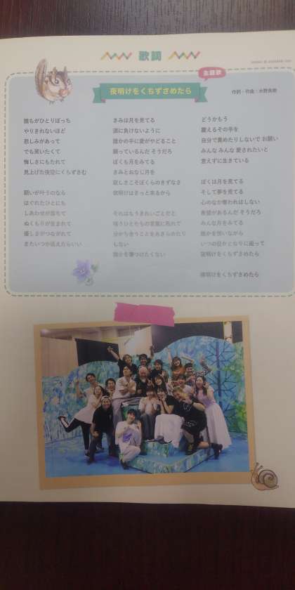 ミュージカルの開催にあたり、主催の公益財団法人ニッセイ文化振興財団「日生劇場」の皆様、出演された演者の方々はじめとするスタッフの皆様に、厚くお礼を申しあげます。そして、ミュージカルにご招待いただき、運営に携わった大阪市教育委員会事務局の指導部の先生方にも、お礼を申しあげます。ありがとうございました。