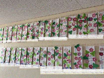 1年生が、夏休み前から夏休みにかけて育ててきた「朝顔の花」が、今度は廊下に咲いています。花は「こすり出し」で表現し、葉っぱは自分の葉をコピーして、その形を画用紙で切り抜きました。作品が集まり、1年生の廊下は、色とりどりの朝顔でとても明るく彩られています。