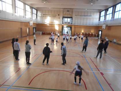 その結果、添付している写真のように、たくさんの先生方が体育館に集まって、子どもたちとドッチボールを楽しむことができました。とっても盛り上がりました。子どもたちと先生方の笑顔がはじけていました。