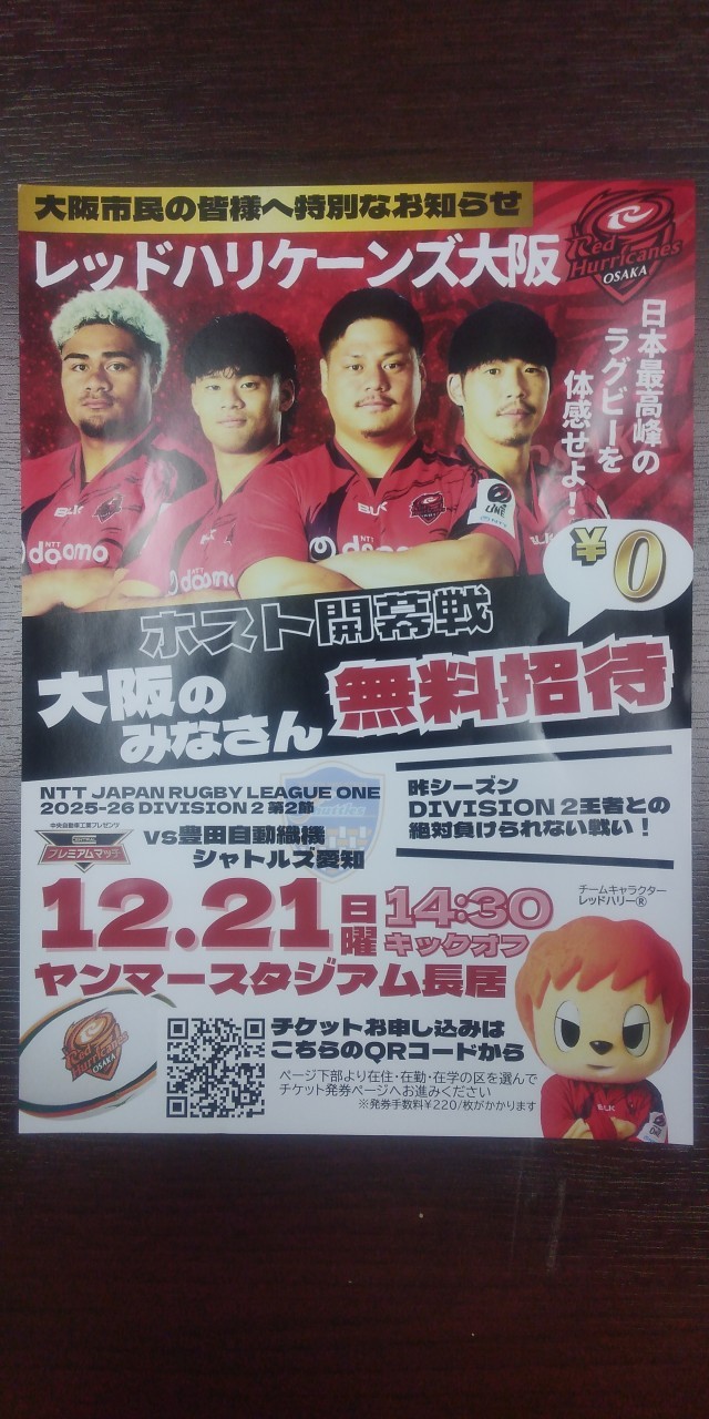 「レッドハリケーンズ大阪」の開幕戦が、12月21日(日)にヤンマースタジアム長居で行われます。添付しているチラシにある通り、大阪市民の皆さんは無料で招待されます。興味のある方は、ぜひ、ご観戦ください。