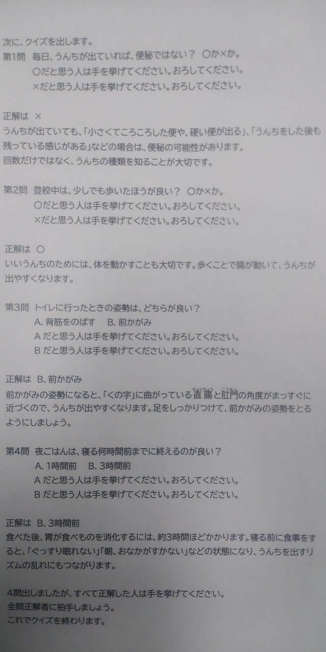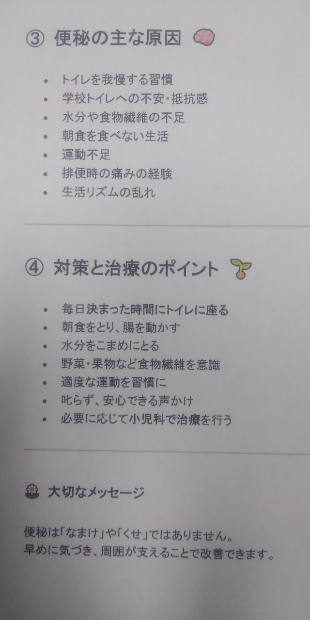 学校医の藤吉 庸雅先生から「小学生の便秘」について、添付しているお手紙を頂戴しました。このメッセージを子どもたちに紹介し、「便秘」について、児童と教職員で理解しました。