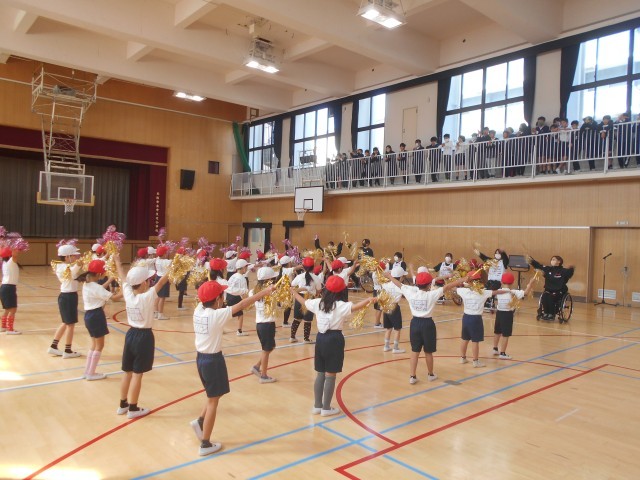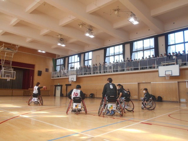 今回の交流のメインは、1年生でした。しかし、せっかくの「ほんまもん」の来校でしたので、体育館の2階ギャラリーを開放し、全学年の児童が車いすバスケットボールのパフォーマンスやゲームを観戦することができるようにしました。