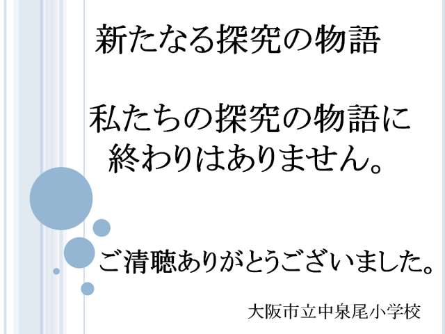 本校で取り組んできた「探究読解学習」と「ほんまもん教育」の実践を、多くの皆さんに発信できたことは、学校の大きな自信となります。特に、発表した先生方には、教育者としての財産になったことと思います。このような機会をいただき、発表に向けてのご指導を賜りました大阪市総合教育センター並びに大阪市教育委員会の担当指導主事の方々に、厚くお礼を申しあげます。ありがとうございました。
