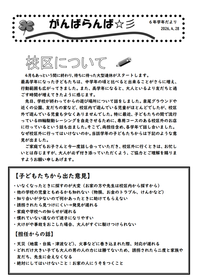 まもなくGWです。ご家庭でも、「学校外での過ごし方」について、お子様や保護者同士で話し合っていただければと思います。子どもたちの心と体と命を守ることができるよう、今後も、家庭と地域と学校が連携していきたいと考えています。