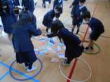 体育の後、講堂で子どもまつりをしました。昨日は自分のクラスのお店で遊びましたが...