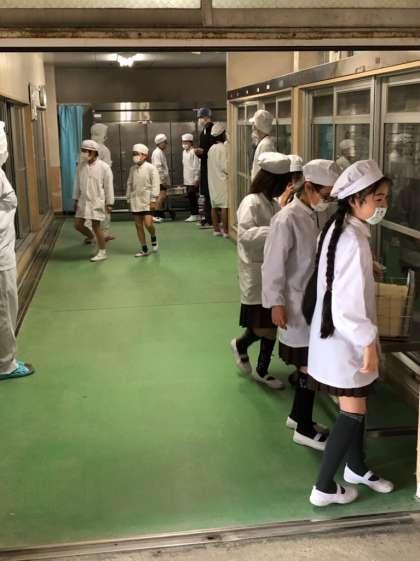 9日から給食が始まりました。6年生は1年生と一緒に給食を運び、配膳をし、高学年として相手を思いやる気持ちがいっぱいのスタートとなりました。