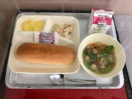 今日の給食は、マカロニ、牛乳、粉末チーズを使用したマカロニグラタンでした。