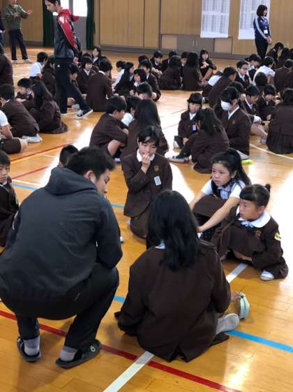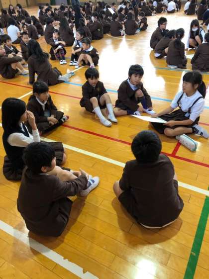 どうぞよろしく集会をしました。これから縦割り班で活動をします。