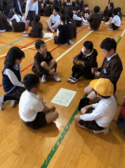 名前を言ったり、班のめあてを決めたりしました。「どんなめあてにする?」「どんな班にしたい?」と高学年が班のみんなに声をかけて、決めることができました。