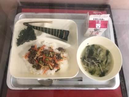 ちまきは、うるち米の粉などで作ったもちを笹の葉で包み、い草で巻いて作られています。児童の成長を願い、毎年登場しています。
