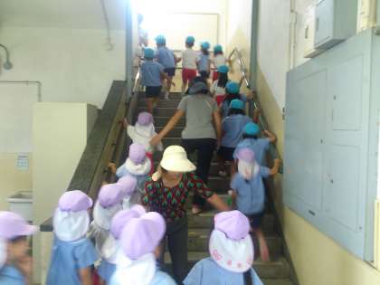 津波で避難する場合、幼稚園の園児は本校校舎3階に避難することになります。今回は、年長組の園児が3階の図工室まで避難しました。幼稚園舎の階段より段差が大きく、上がり下りに苦労していましたが、がんばって避難していました。